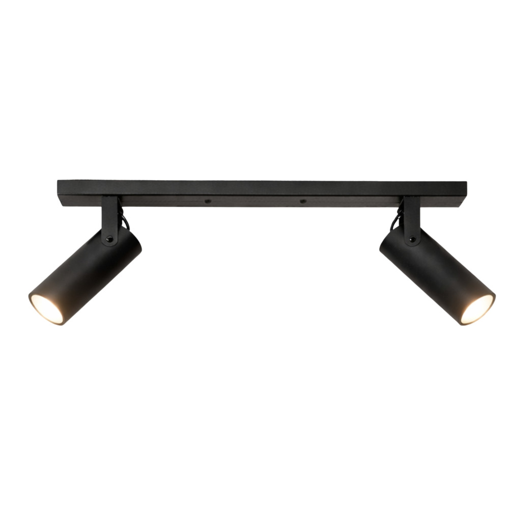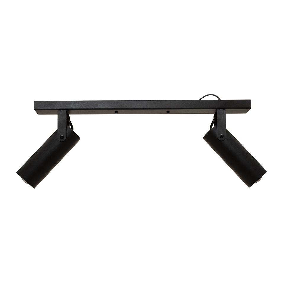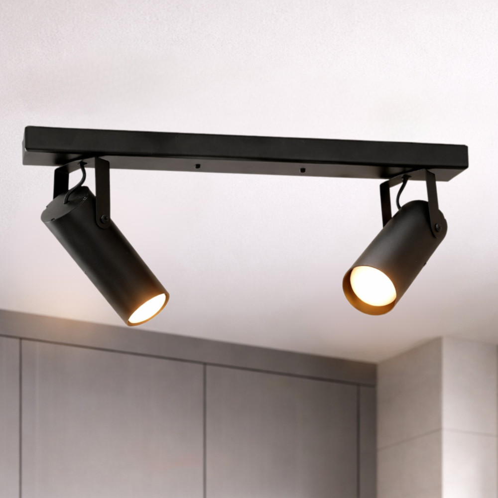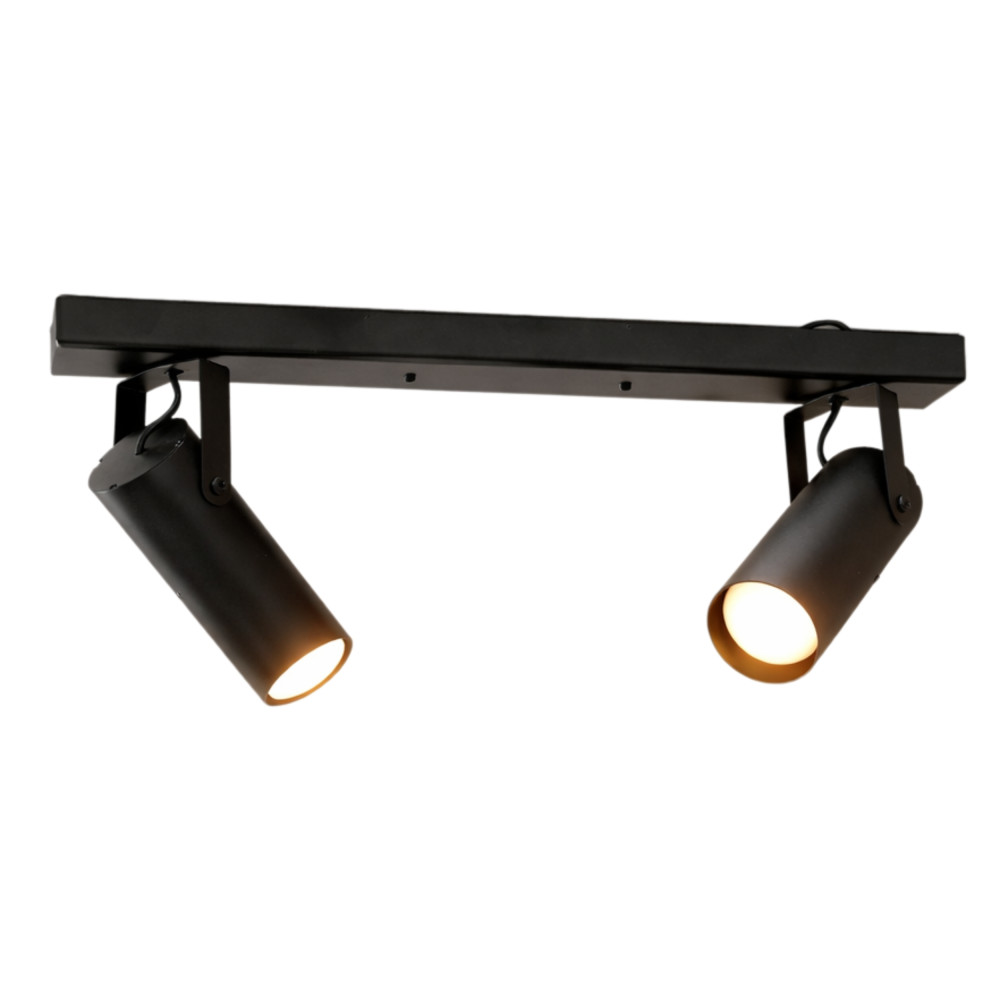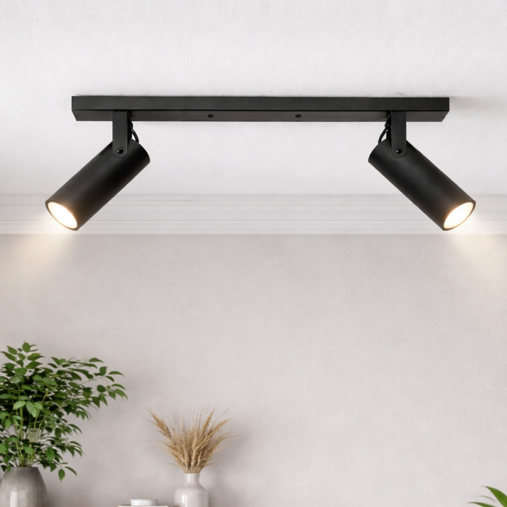 Сучасний стельовий світильник спот на дві лампи з довгим металевим корпусом і поворотними плафонами циліндричної форми. Цей світильник буде доречним для освітлення 6 м² приміщення, може використовуватися як додаткове так і основне джерело освітлення, відмінно підійде для невисоких стель.