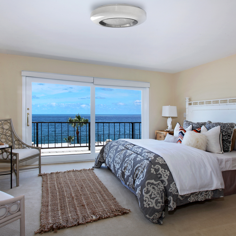 Дизайн. Завдяки прозорим вкрапленням у плафоні та теплим та білим світлодіодам забезпечується ефект мерехтіння (зоряного неба) при включеному світильнику. Крім того, модель відрізняється наявністю прозорого отвору в центрі світильника, покритого стразами, у включеному стані нагадують мерехтіння дорогоцінного каміння.
