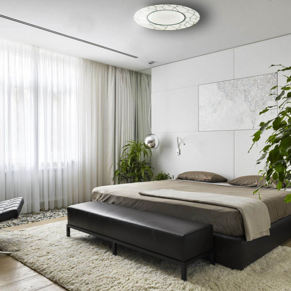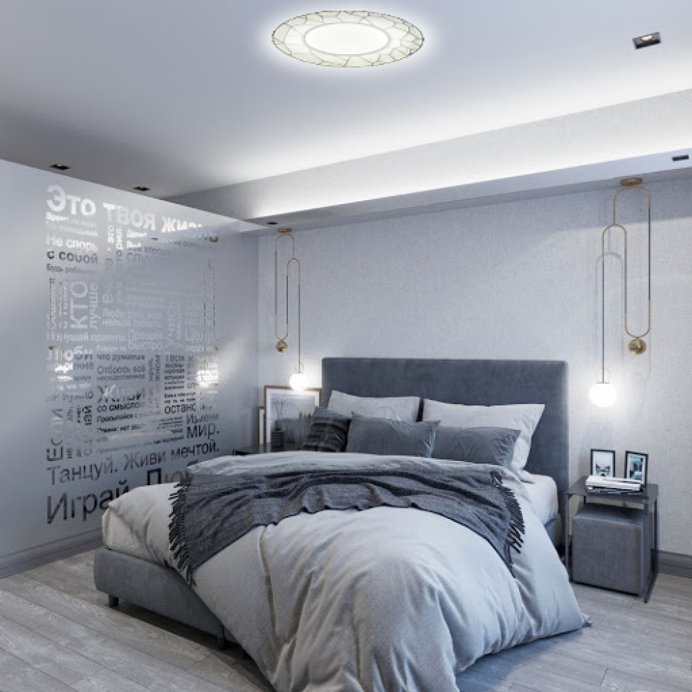 Незвичайний дизайн у вигляді мозаїки стане відмінним елементом інтер'єру. Завдяки прозорим вкрапленням у плафоні та теплим та білим світлодіодам забезпечується ефект мерехтіння (зоряного неба) при включеному світильнику.