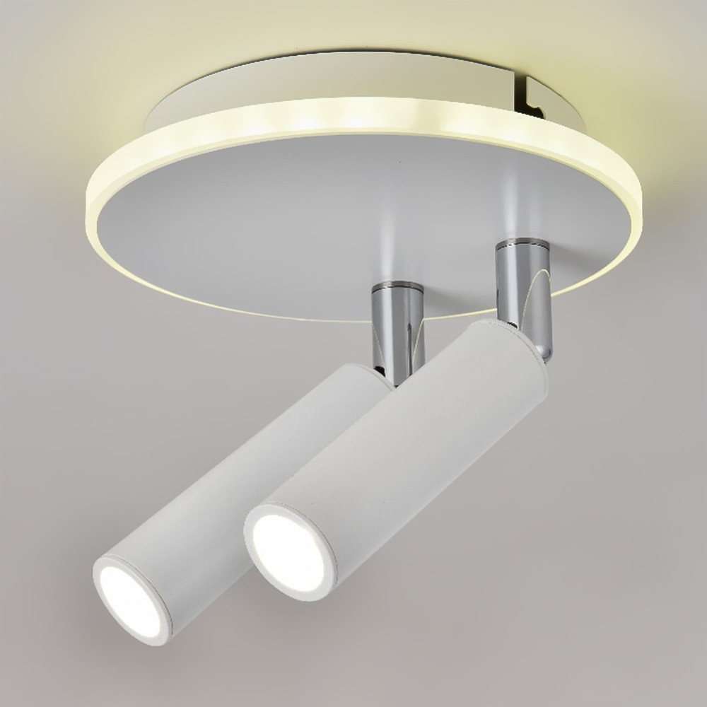Світлодіодний світильник на два джерела світла з поворотними плафонами циліндричної форми та з підсвічуванням корпусу.
