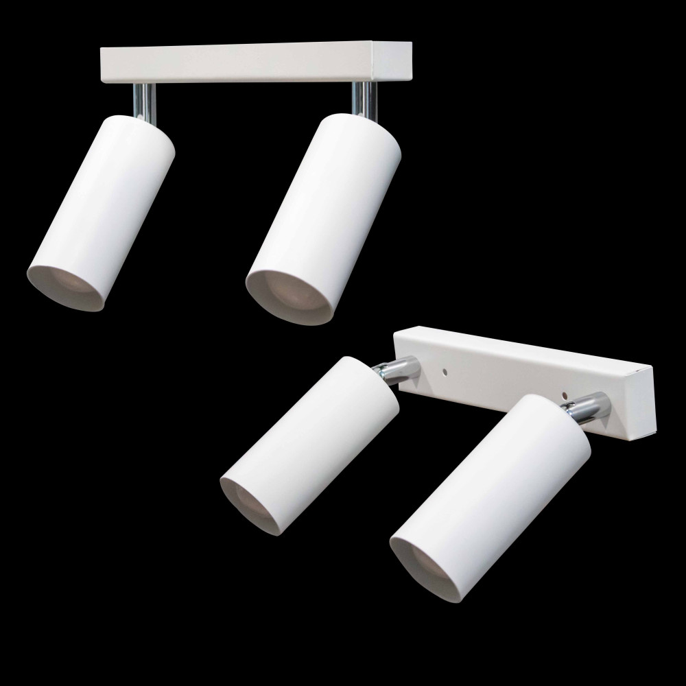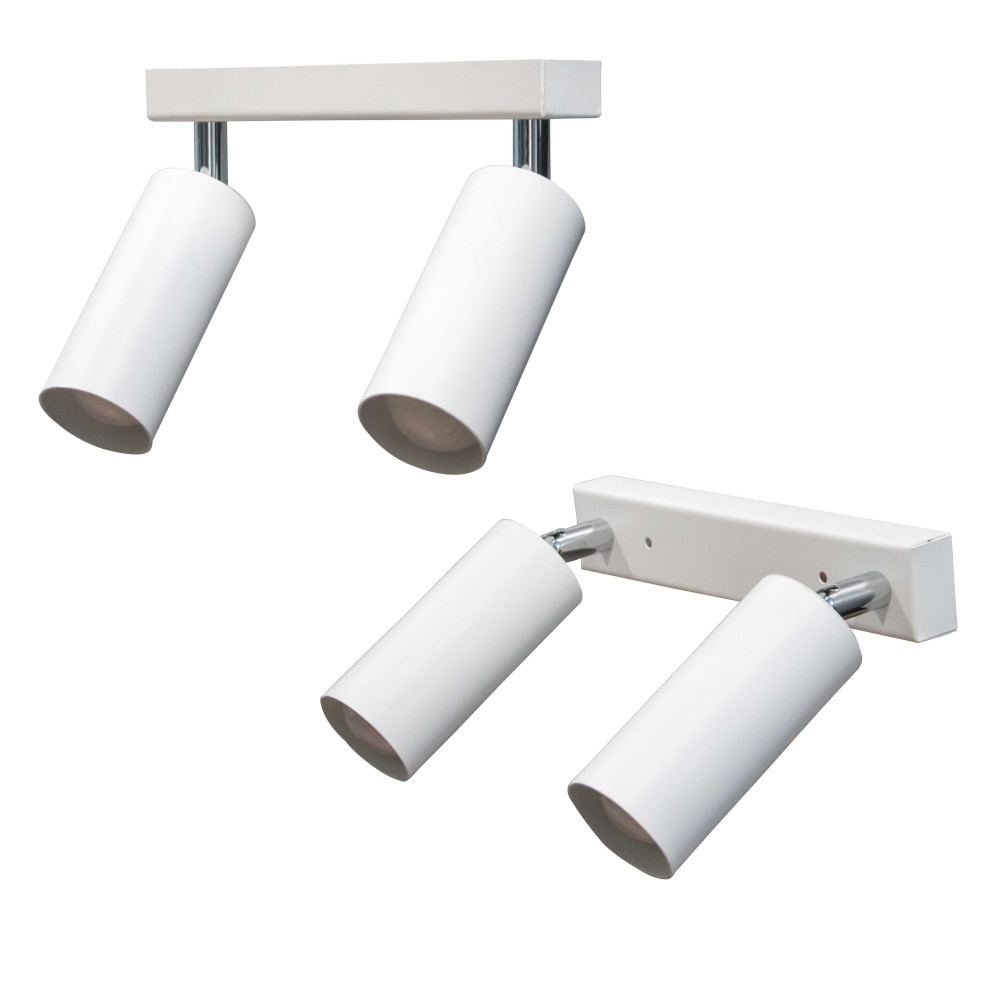 Настінно-стельовий світильник на дві лампи із металевими плафонами циліндричної форми з поворотним механізмом.