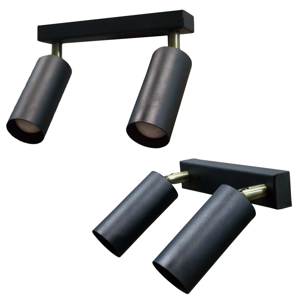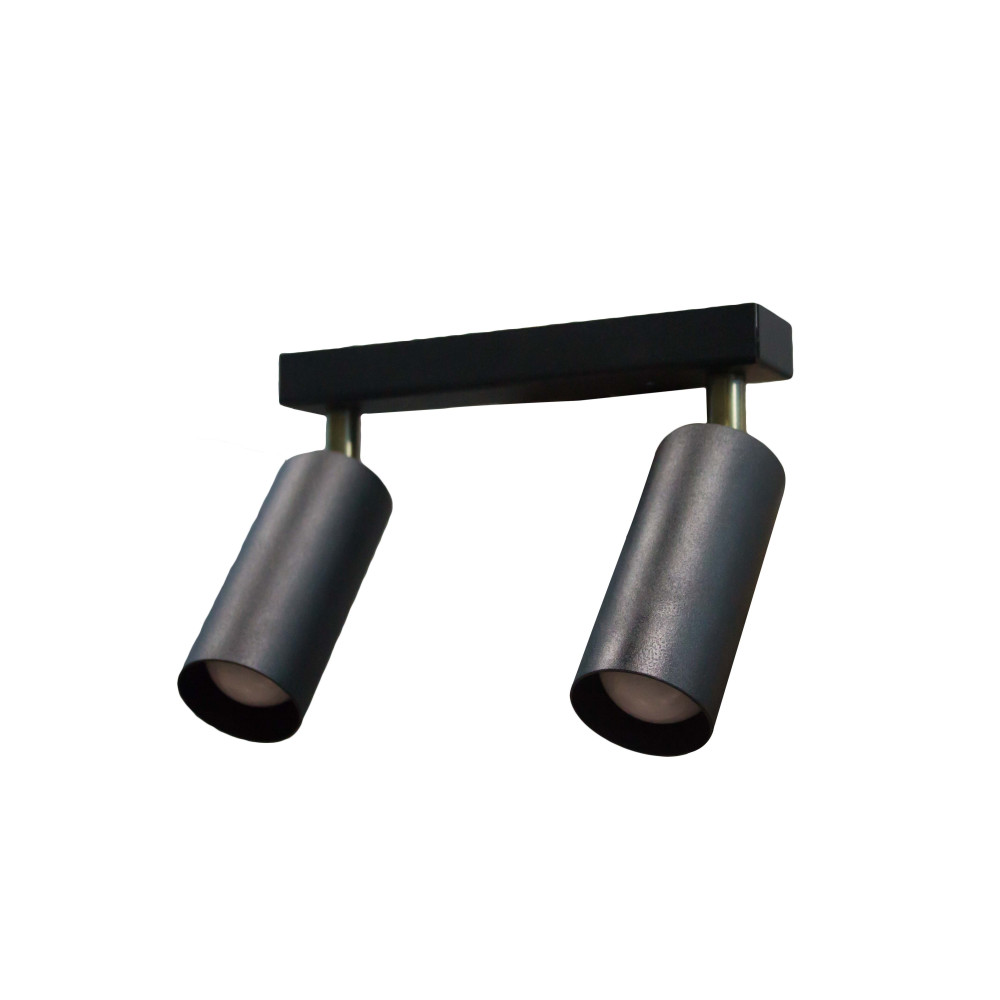 Настінно-стельовий світильник на дві лампи із металевими плафонами циліндричної форми з поворотним механізмом.