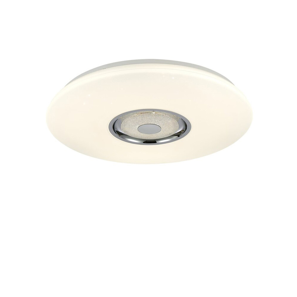 Сучасний стельовий світлодіодний музичний смарт світильник на одне джерело світла з регулюванням колірної температури, RGB підсвічуванням, має круглу плоску форму, оснащений пультом управління. Найкраще підійде для освітлення 12 м² приміщення, буде актуальним для невисоких стель.