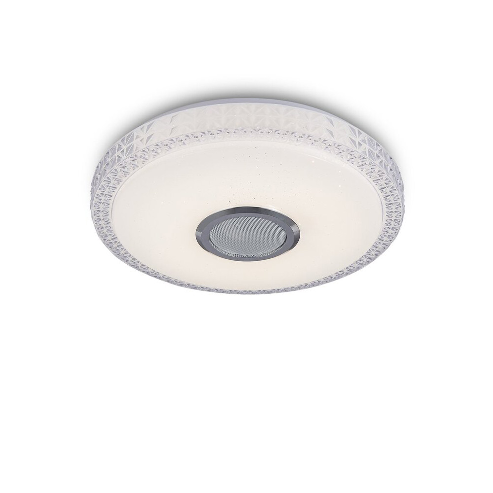 Сучасний стельовий світлодіодний музичний смарт світильник на одне джерело світла з регулюванням колірної температури, RGB підсвічуванням, має круглу плоску форму, оснащений пультом управління. Найкраще підійде для освітлення 12 м² приміщення, буде актуальним для невисоких стель.