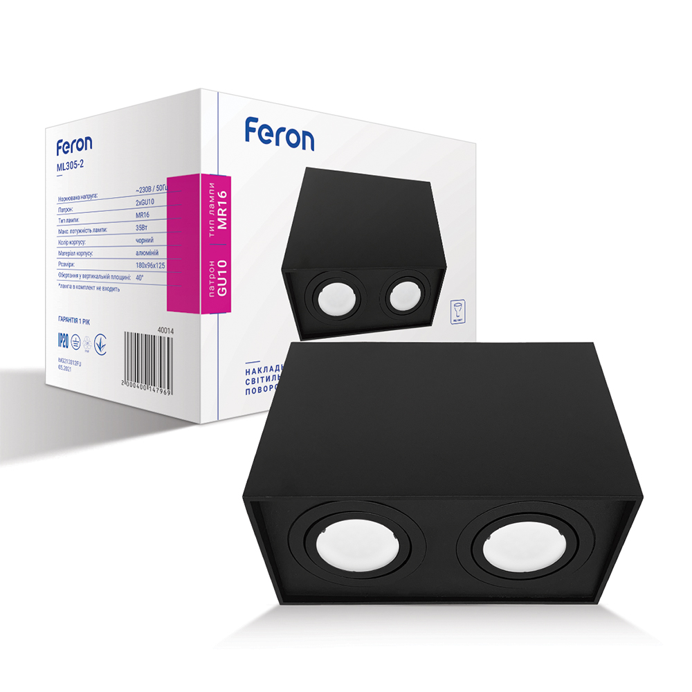 Накладний точковий світильник Feron ML305-2 може використовуватися як основне, так і акцентне освітлення у сфері інтер'єрного підсвічування житлових, торгових та адміністративних приміщень, кафе та ресторанів, виставкових залів, галерей тощо.