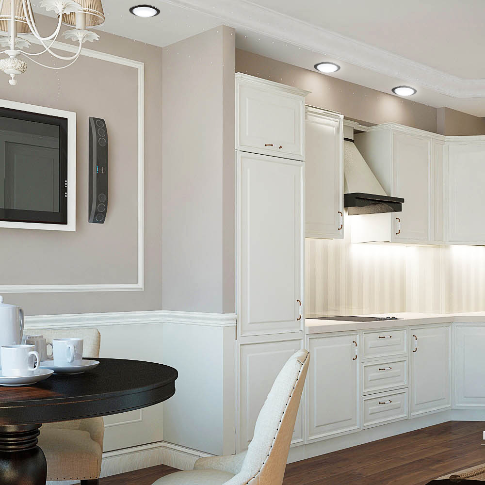 Лампа типу GX53, що використовується у світильнику, має значну площу світіння, виступає за межі світильника і розсіює світло не лише вниз, а й убік. Це забезпечує максимальне розсіювання світла від такого світильника. У комплект світильника входить термокільце, яке захищає матеріал натяжної стелі від розриву, перегріву, втрати кольору та деформації.
