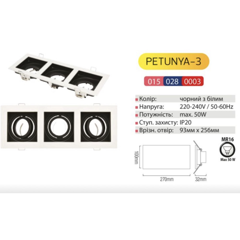Кількість джерел світла: 3 лампи MR-16 (не входить до комплекту)Робоча напруга: 175-240 В (змінний)