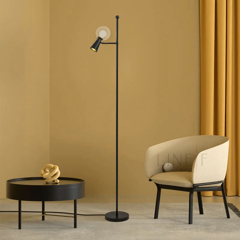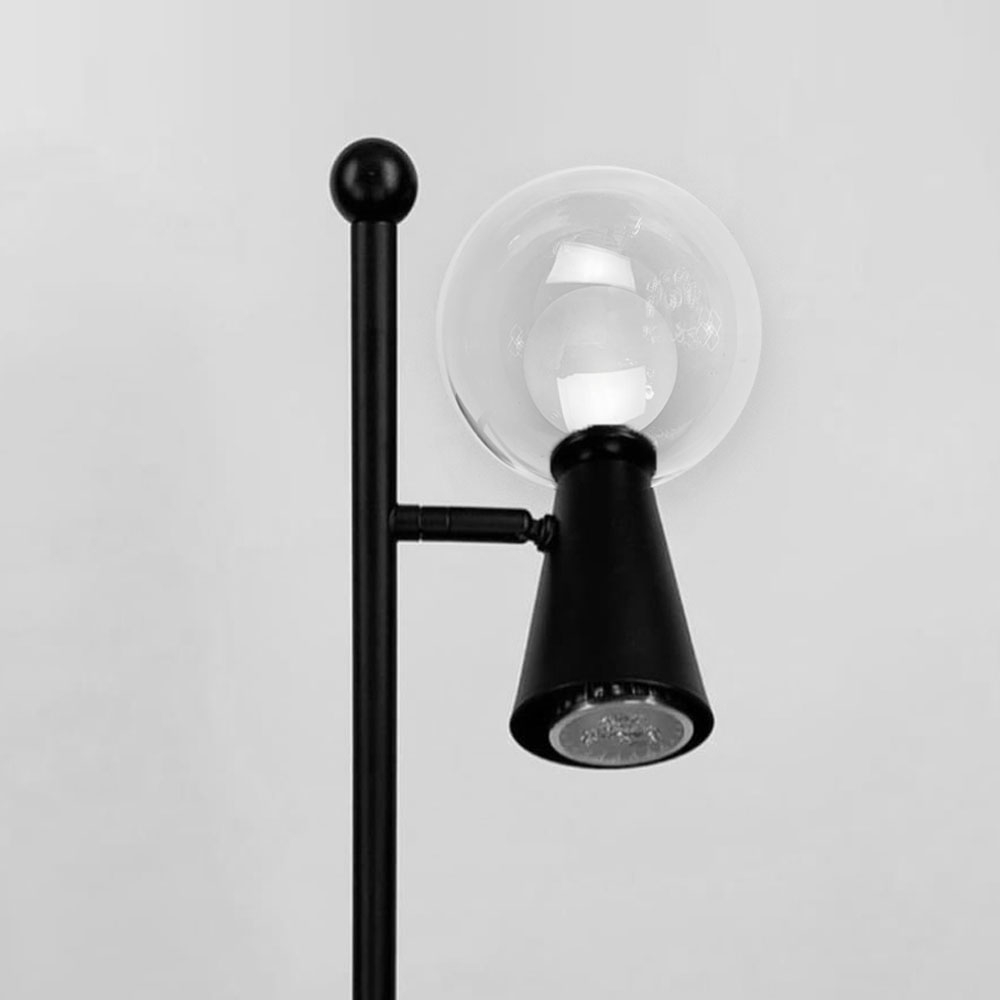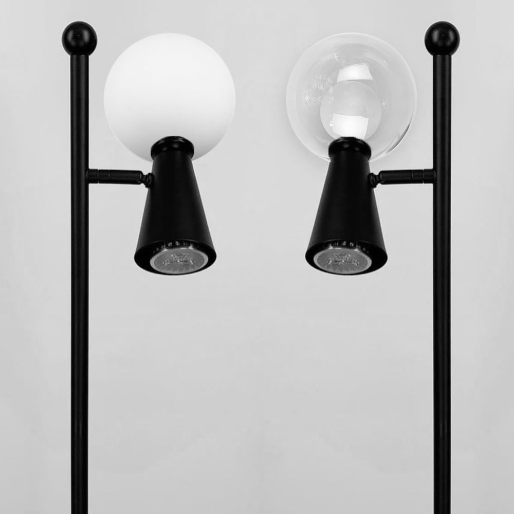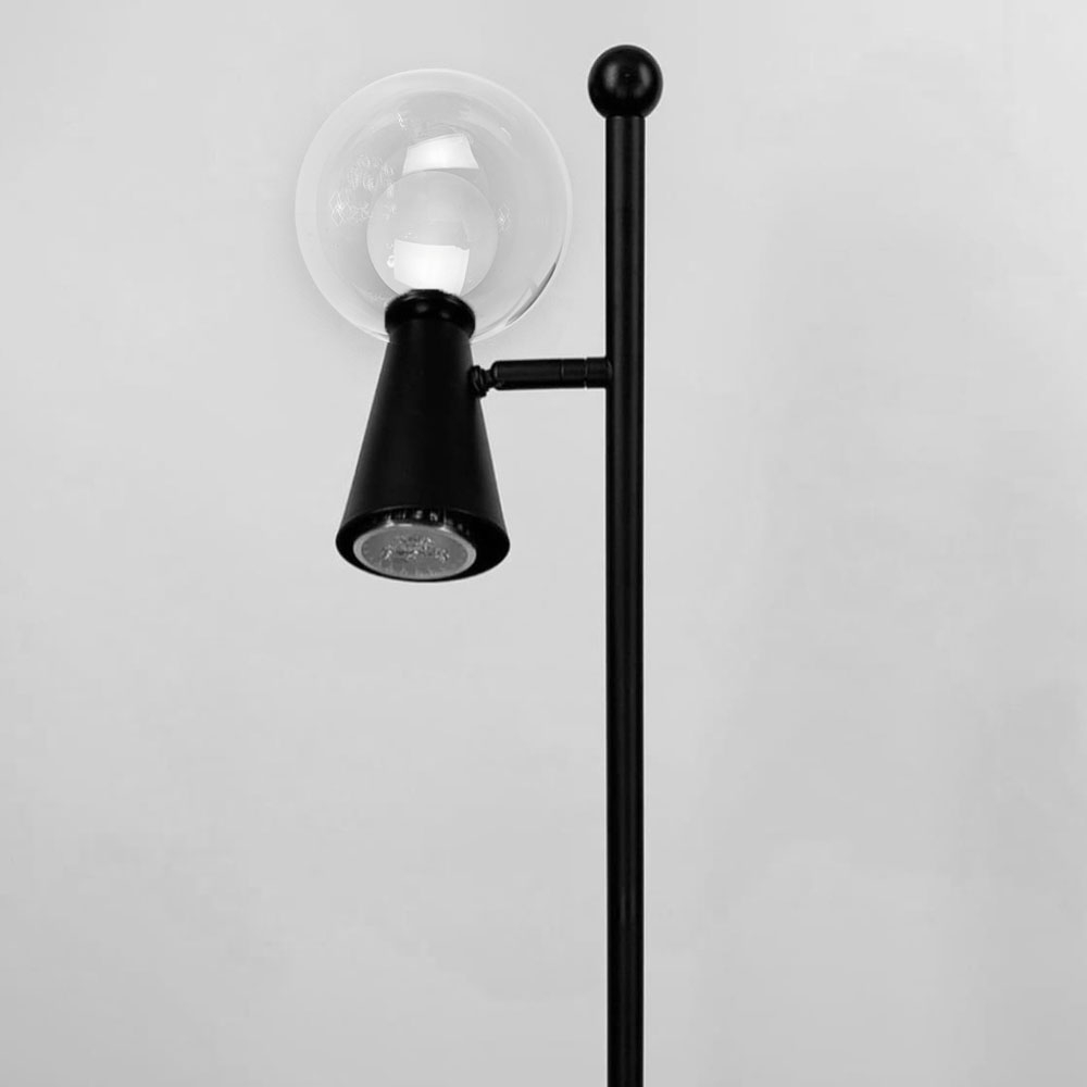 Торшер ABELINA у чорному металевому корпусі з плафоном на два джерела світла: скляний плафон-куля (подвійне скло (прозорий + матовий)) з цоколем G9 - 1 шт металевий плафон у вигляді споту (конусоподібний) з цоколем GU10 - 1 шт Представляємо серію інтер'єрних освітлювальних приладів ABELINA із складовими подвійними плафонами у формі кулі та конуса. Однією з переваг цих світильників є регуюючий механізм на основі кріплення плафона. Серія ABELINA йде в наступних кольорах скляного плафона: білий та подвійне скло (прозорий + матовий) та містить такі освітлювальні прилади: кругла люстра (на 6 подвійних плафонів, що розміщені по колу корпусу) видовжена люстра (на 3 або 5 подвійних плафонів) бра торшер настільна лампа
