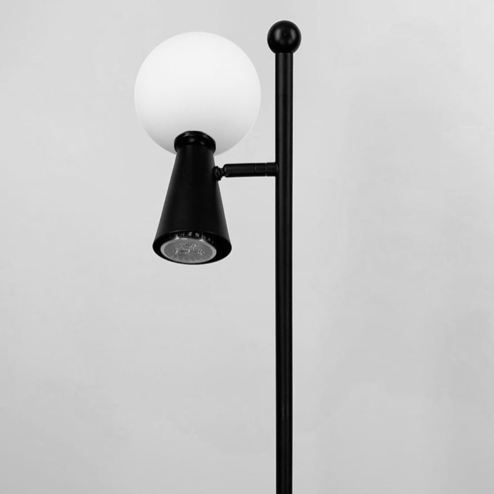 Торшер ABELINA у чорному металевому корпусі з плафоном на два джерела світла: скляний плафон-куля (біле скло) з цоколем G9 - 1 шт металевий плафон у вигляді споту (конусоподібний) з цоколем GU10 - 1 шт Представляємо серію інтер'єрних освітлювальних приладів ABELINA із складовими подвійними плафонами у формі кулі та конуса. Однією з переваг цих світильників є регуюючий механізм на основі кріплення плафона. Серія ABELINA йде в наступних кольорах скляного плафона: білий та подвійне скло (прозорий + матовий) та містить такі освітлювальні прилади: кругла люстра (на 6 подвійних плафонів, що розміщені по колу корпусу) видовжена люстра (на 3 або 5 подвійних плафонів) бра торшер настільна лампа