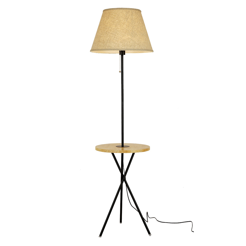 Підлоговий світильник торшер на одну лампу в сучасному стилі з абажуром тканини і дерев'яним столиком.