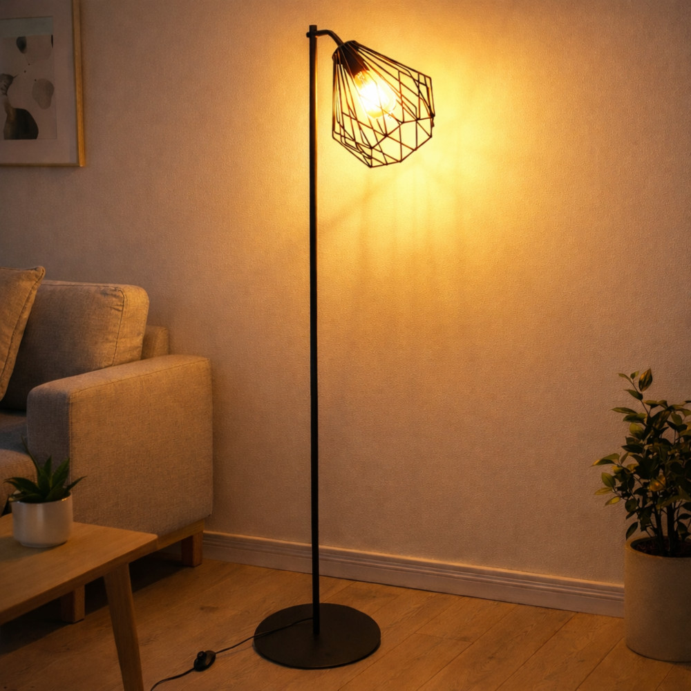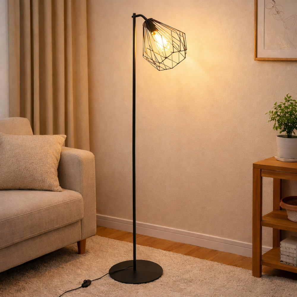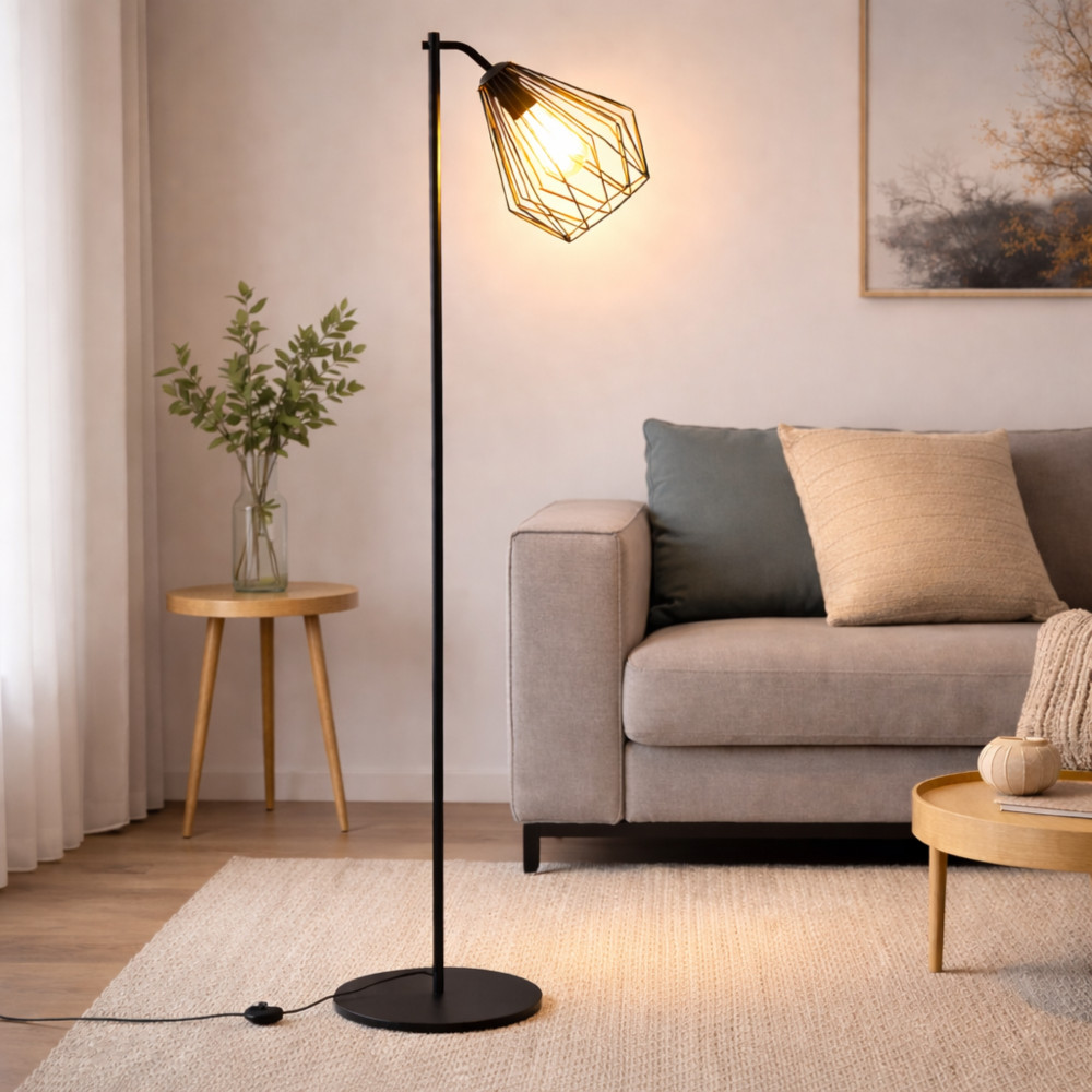 Геометричний каркас абажура робить світильник легким та візуально повітряним, при цьому не втрачаючи міцності. Завдяки відкритій конструкції він чудово підходить для декоративних ламп у стилі ретро, таких як моделі з ниткою розжарення або лампи Едісона, створюючи м'яке та атмосферне свічення у кімнаті. Опора виконана з міцного металу, забезпечуючи стійкість навіть за інтенсивної експлуатації. Провід забезпечений ножним вимикачем, що робить використання світильника особливо зручним у повсякденному житті.