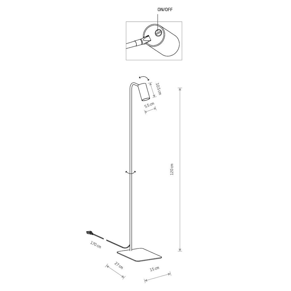 Висота торшера становить 1200 мм, довжина – 270 мм, ширина – 150 мм. При виборі враховуйте площу кімнати та функцію, яку світильник повинен виконувати: декоративну чи практичну.