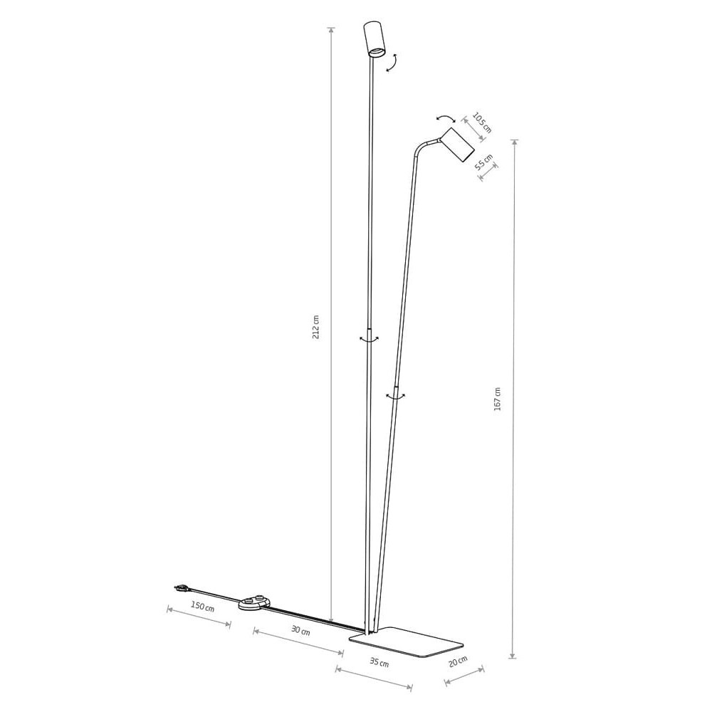 Висота торшера становить 2120 мм, довжина – 350 мм, ширина – 200 мм. При виборі враховуйте площу кімнати та функцію, яку світильник повинен виконувати: декоративну чи практичну.
