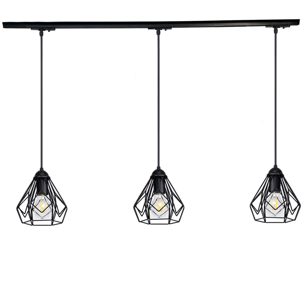 Сучасний підвісний трековий світильник (підвісна люстра) у стилі лофт на три лампи з металевими плафонами у вигляді клітки.