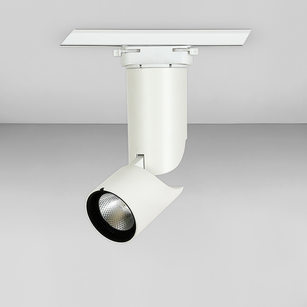 Стильний трековий світильник у вигляді прожектора з поворотним механізмом, має одне джерело світла, живиться від мережі 220В. Ідеально підходить для низьких стель.