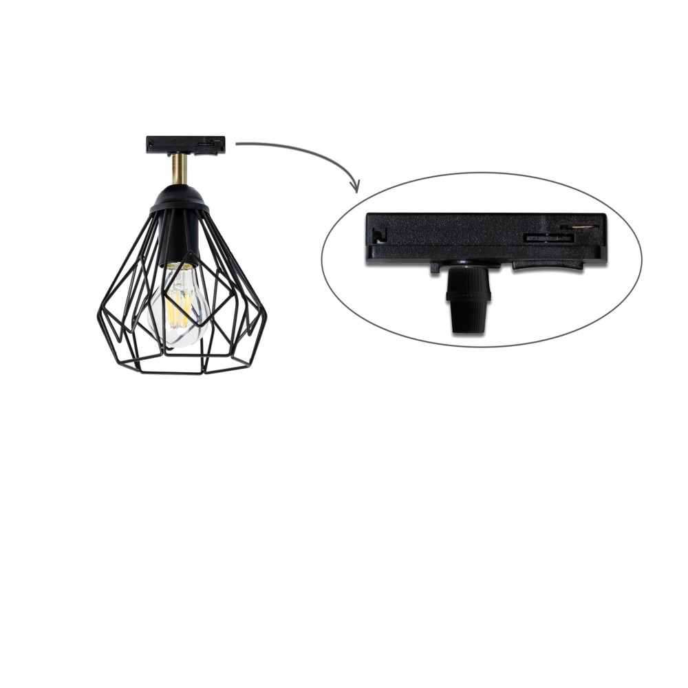 Сучасний стельовий трековий світильник у стилі Лофт на одну лампу з металевим плафоном у вигляді клітки конусної форми. Ця модель світильника відноситься до категорії трекових. Цей новий тип освітлювальних приладів набирає популярності як в офісних, так і в домашніх інтер'єрах.