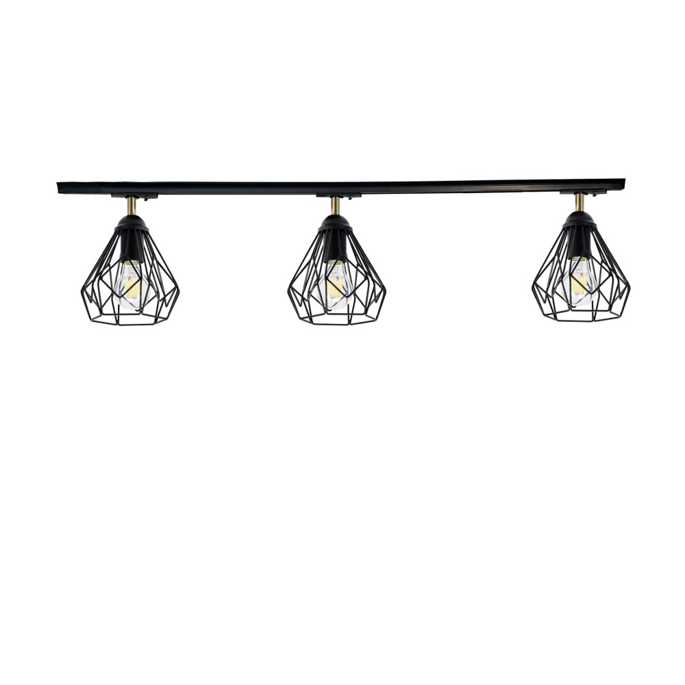 Сучасні стельовий трековий світильник у стилі Лофт на три лампи з металевими плафонами у вигляді клітки конусної форми. Ця модель світильника відноситься до категорії трекових. Цей новий тип освітлювальних приладів набирає популярності як в офісних, так і в домашніх інтер'єрах.