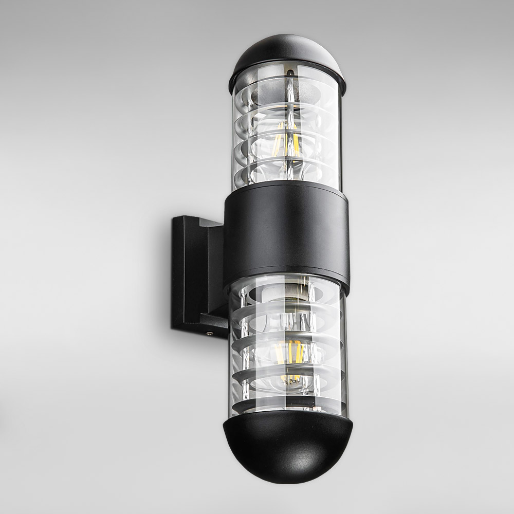 Вуличний настінний світильник на дві лампи з плафоном циліндричної форми.